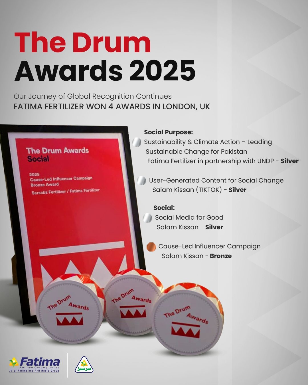 Rabel Sadozai, Director Marketing and Sales at Fatima Fertilizer, while expressing her pride in the achievement stated, “These awards are a testament to the power of purpose-led communication and the authenticity of our mission. Farmers are the backbone of Pakistan, and our campaigns aim not just to highlight their contributions but to give them the national recognition they deserve. Winning four global awards at The Drum 2025 (UK) reinforces our belief that meaningful storytelling, rooted in respect for the people who feed the nation, can inspire real change at home and admiration abroad.”