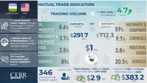 At the invitation of the President of the United States, Donald Trump, the President of Uzbekistan, Shavkat Mirziyoyev is paying a working visit to Washington, D.C. from February 17–19 to participate in the inaugural meeting of the Peace Council. The Center for Economic Research and Reforms (CERR) has prepared an infographic presenting key indicators of trade, economic and investment cooperation between Uzbekistan and the United States over the past 9 years.