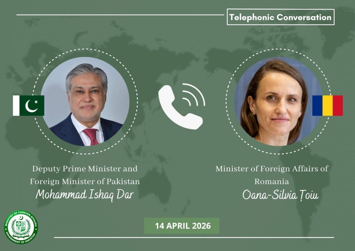 Deputy Prime Minister / Foreign Minister Senator Mohammad Ishaq Dar on Tuesday received a telephone call from Romanian Foreign Minister Oana-Silvia Toiu. The Romanian Foreign Minister Toiu appreciated Pakistan’s role in facilitating the Islamabad talks between US and Iran. Both leaders welcomed the positive momentum in Pakistan-Romania relations and reaffirmed their commitment to further strengthen cooperation. They also exchanged views on regional and global issues, agreeing on the importance of continued dialogue and diplomacy for the peaceful resolution of conflicts.